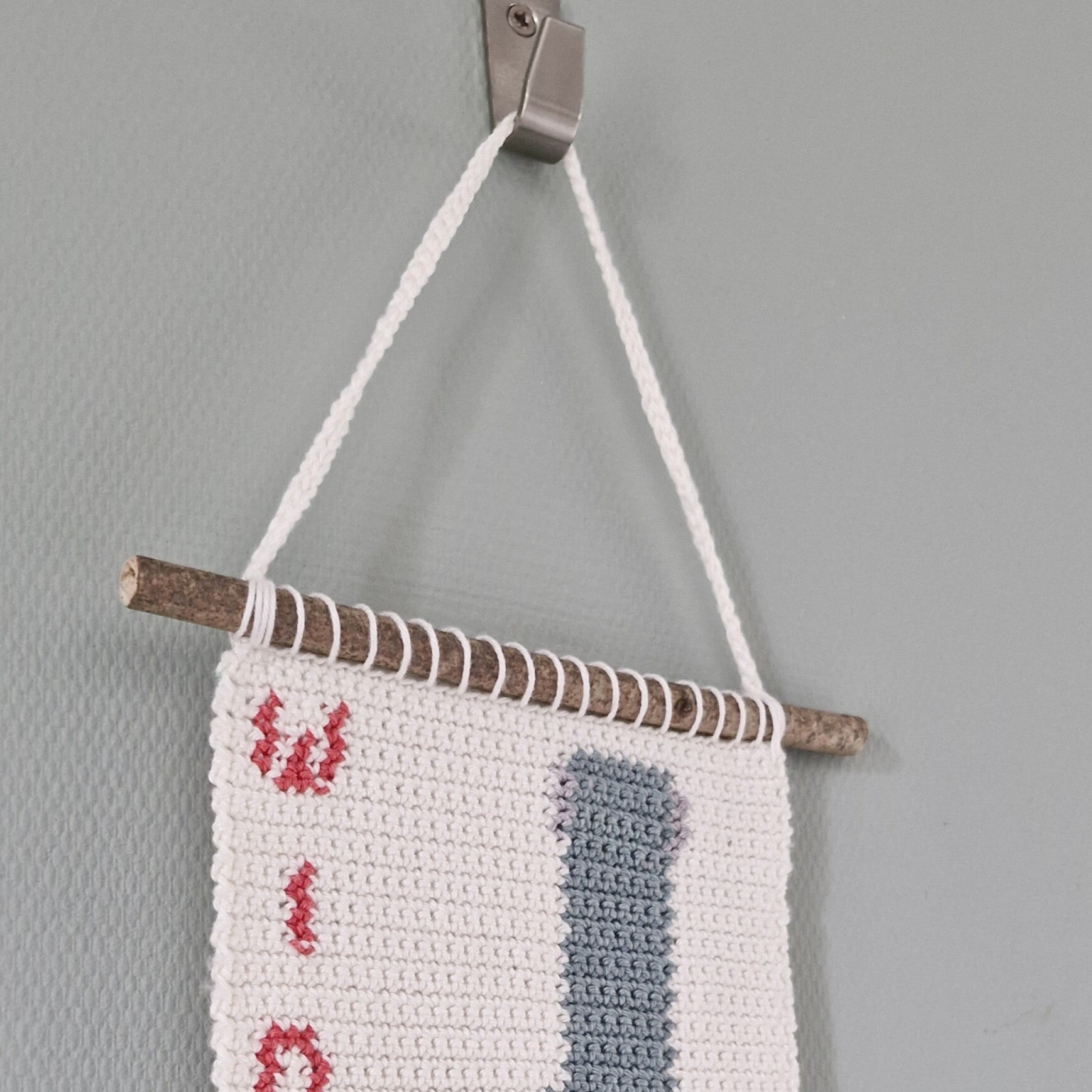Je haakt de wandhanger in de intarsia-techniek. Bij deze techniek wissel je van kleur bij de laatste omslag van de vorige steek en ga je verder met de nieuwe kleur. De niet gebruikte kleur laat je aan de achterkant van je werk hangen. TIP: lees ook mijn BLOG over deze techniek