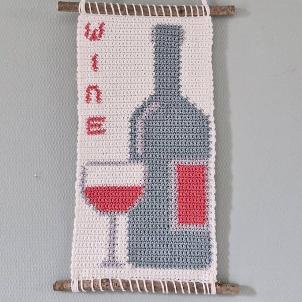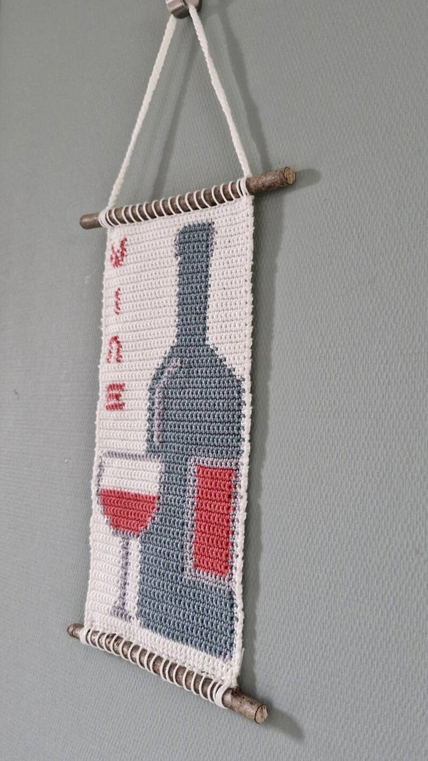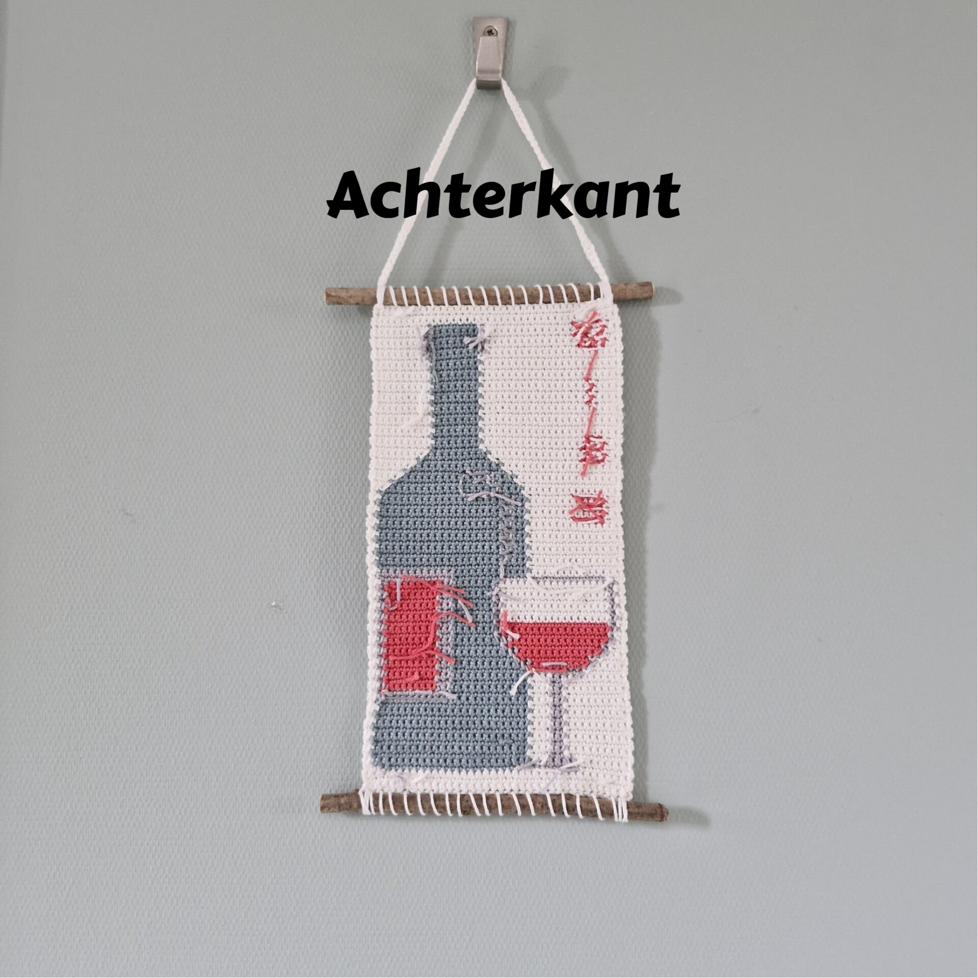 Gehaakte wandhanger met wijnfles, speciaal voor linkshandigen